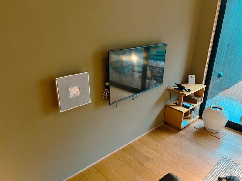 壁掛けテレビの横には、スマートスピーカー。
