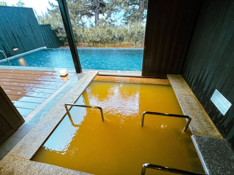金温泉の奥に見えるのは、プライベートインフィニティプール。