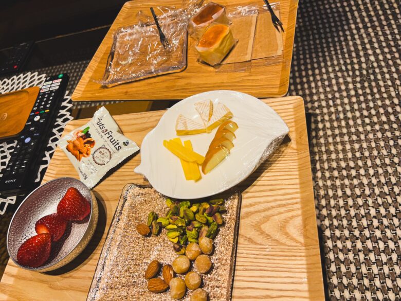 チーズやナッツなどお酒のお供があり、お部屋で美味しくいただきました。
