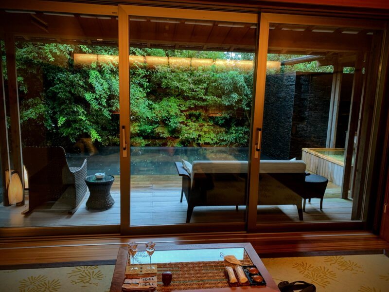 露天風呂はこんな感じで、外にもソファーがあって水盤の庭を楽しめそう。