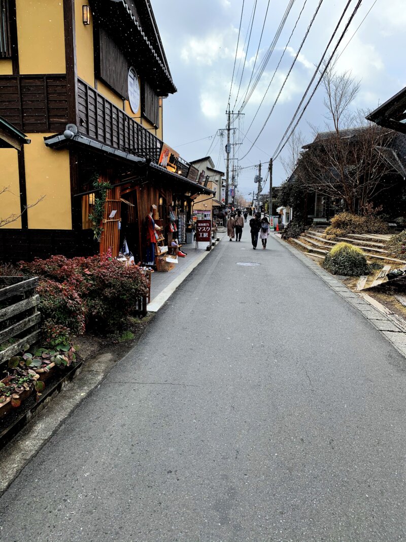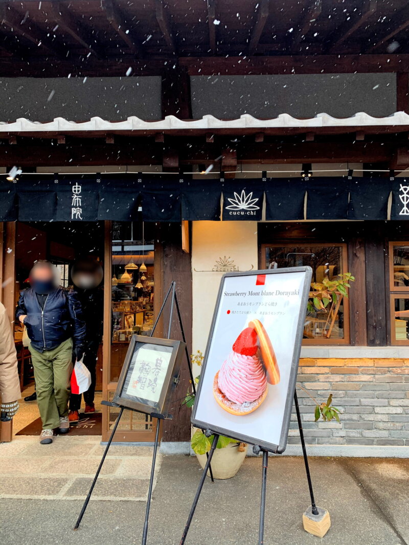 到着した頃にはけっこう雪が降ってきて、かなり極寒でした。標高454mの由布院盆地は、冬は氷点下になるほど寒く、夏はそれなりに暑いそうです。