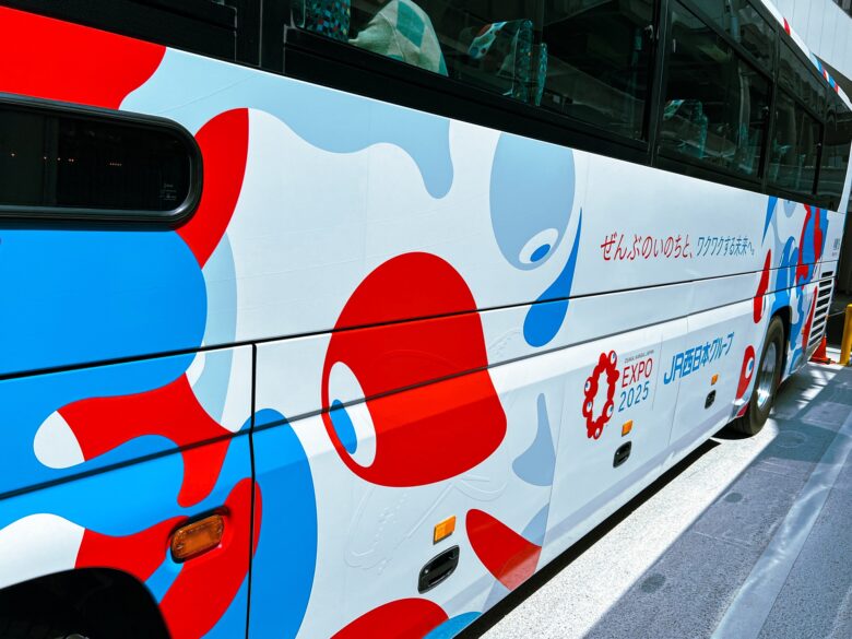 まだ5月と万博が始まったばかりのせいか、万博カラーのバスを珍しそうに通行人の方々が見てました。