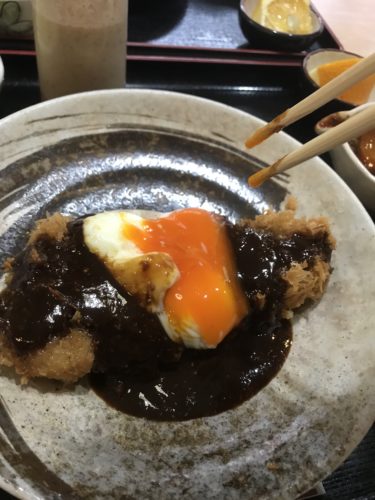 こちらが、ボクの頼んだ【焙煎ごま味噌ロースかつ定食】。半熟たまごがかつの上に乗っちゃってます。ノリノリです。見た目からウマそう。ココに、焙煎のごま味噌をかけて、たまごを割ったところがシャッターチャンス‼と、メニューにも書いてあったのでさっそくチャレンジ。